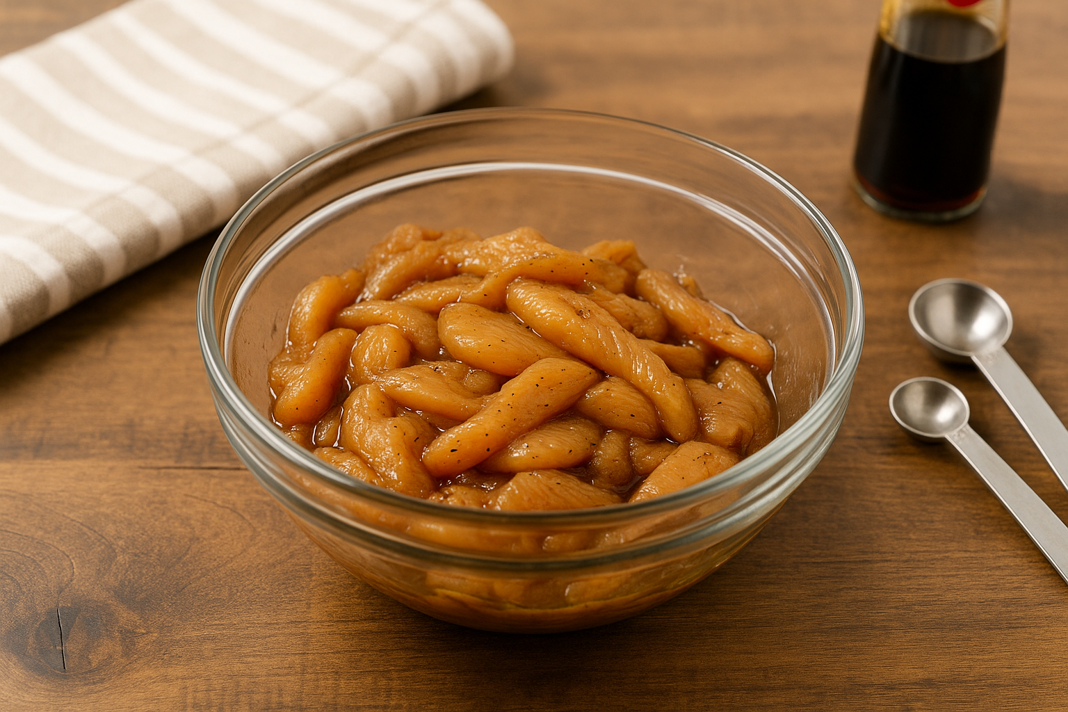 Place the thinly sliced, boneless, skinless chicken breasts in a mixing bowl. Add one tablespoon soy sauce, one tablespoon cornstarch, and 1/4 teaspoon black pepper. Toss everything together until the chicken pieces are well coated. Set aside to marinate while you prepare the other ingredients—this helps the chicken stay tender and flavorful during stir-frying.