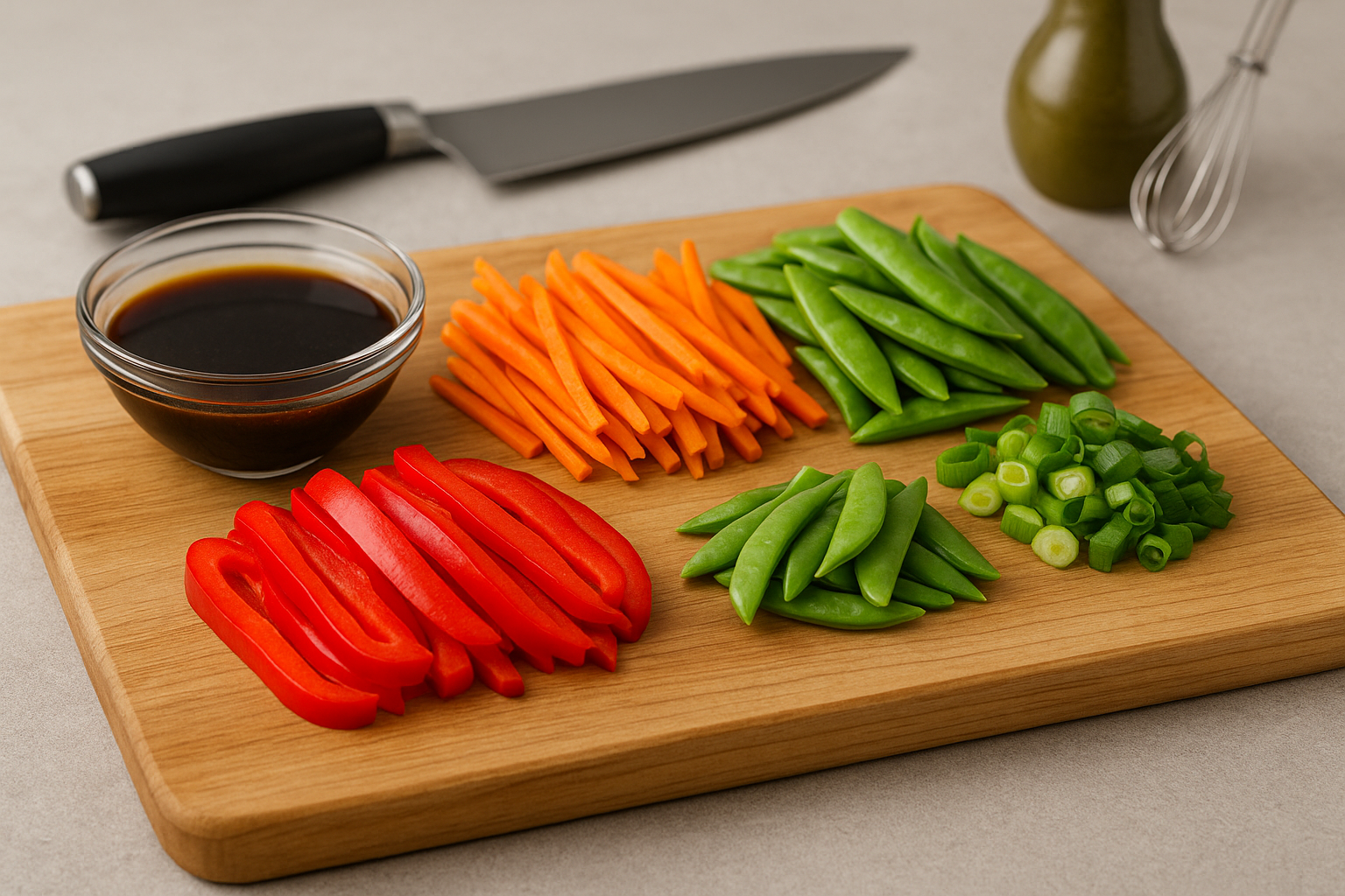 Begin by washing and preparing your vegetables. Thinly slice the red bell pepper and julienne, thinly slice the carrot, trim the snap peas, and cut the green onions. Set these aside on a plate or tray. In a small mixing bowl, combine and mix the soy sauce, oyster sauce, hoisin sauce, toasted sesame oil, brown sugar, rice vinegar, sriracha (or chilli garlic sauce), and water. Whisk well until the sauce is smooth and the sugar is dissolved. Place the bowl of sauce next to your prepped veggies for easy access during stir-frying.