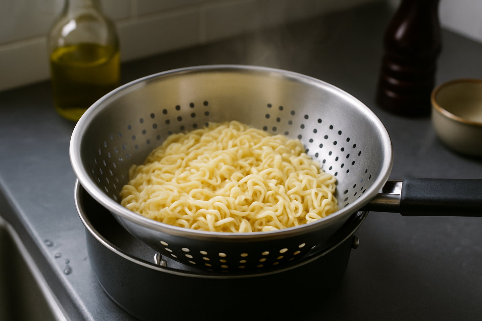Take a medium saucepan of water to a boil over high heat. Add the ramen noodles (without the seasoning packets) and cook according to the package instructions, typically 2 to 3 minutes, until they are just tender but still springy to the bite. Immediately drain the noodles in a colander and rinse briefly under cold water to stop the cooking and keep them from sticking together. Set the cooked noodles aside while you stir-fry the other ingredients.