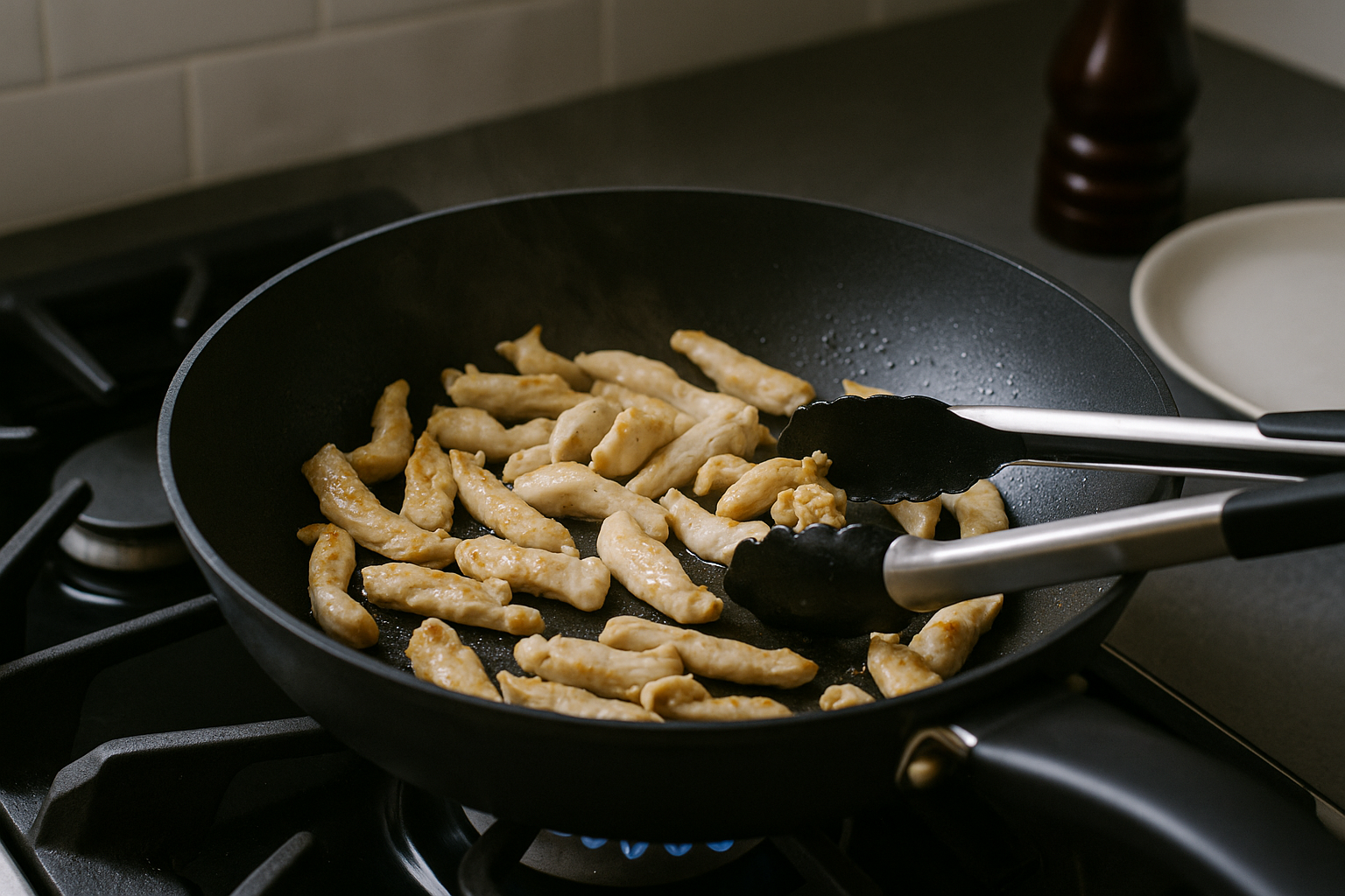 Heat one tablespoon of vegetable oil in a large nonstick skillet or wok over medium-high heat. Once the oil is hot and shimmering, add the marinated chicken slices in a single layer. Let them cook undisturbed for 1–2 minutes, then stir-fry for an additional 2–3 minutes until the chicken is cooked through and lightly browned. Transfer the cooked chicken to a clean plate and set aside. Wipe out the pan if needed, ready for the next step.