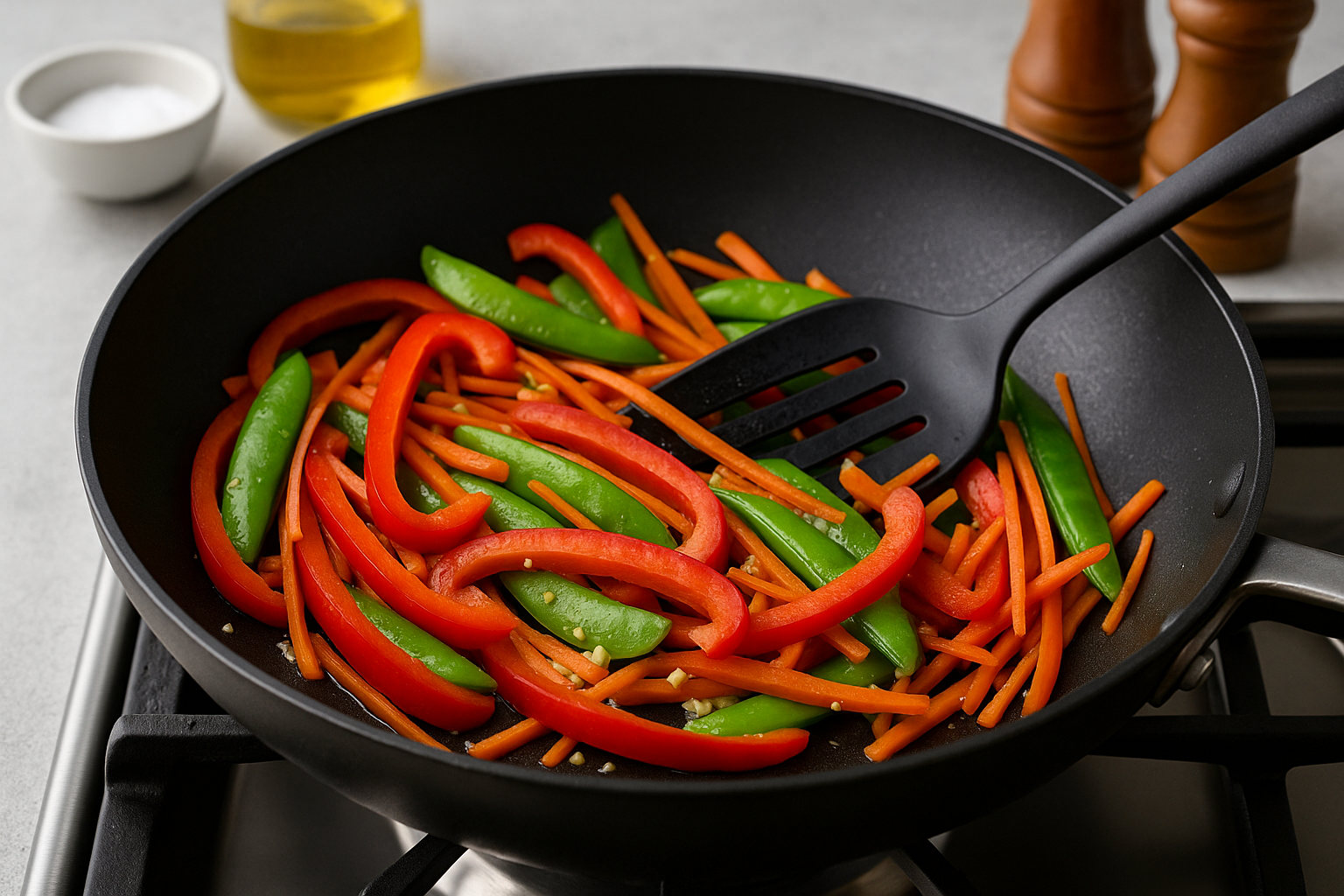 In the same skillet or wok, add the remaining 1 tablespoon of vegetable oil if needed and heat over medium-high. Add the minced garlic and grated ginger, stirring quickly for about 30 seconds until fragrant. Then, add the sliced red bell pepper, julienned carrot, and snap peas. Stir-fry the vegetables for 2–3 minutes, just until they’re crisp-tender and vibrant. Stir frequently to prevent burning and ensure the vegetables cook evenly.