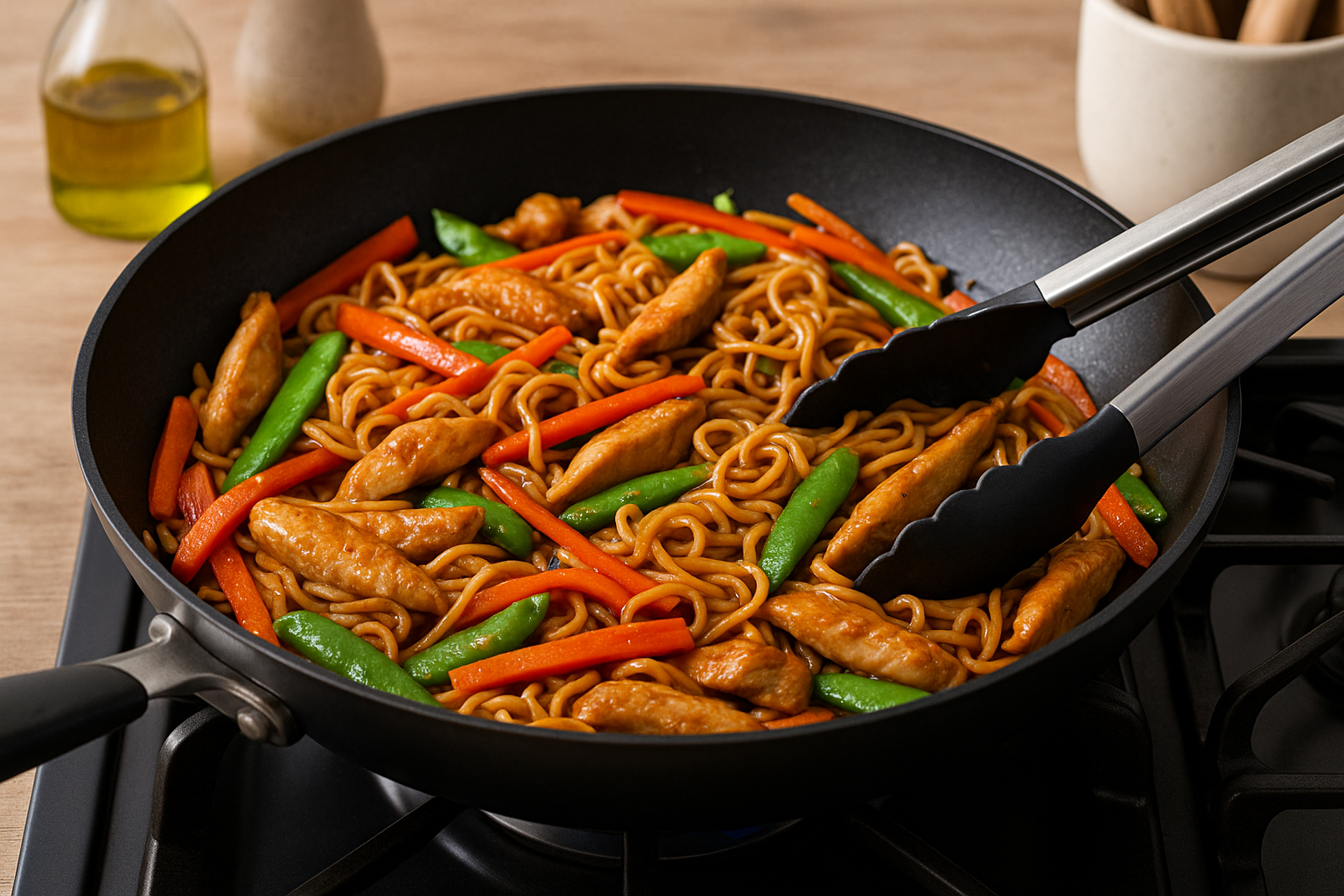 Return the cooked chicken to the skillet with the vegetables. Add the drained ramen noodles to the pan, then pour in the prepared stir-fry sauce. Using tongs or a spatula, gently toss everything together so the sauce coats the chicken, noodles, and veggies evenly. Stir-fry for 2–3 minutes, just until everything is heated through and the noodles are glossy and flavorful. Taste and adjust seasoning if needed.