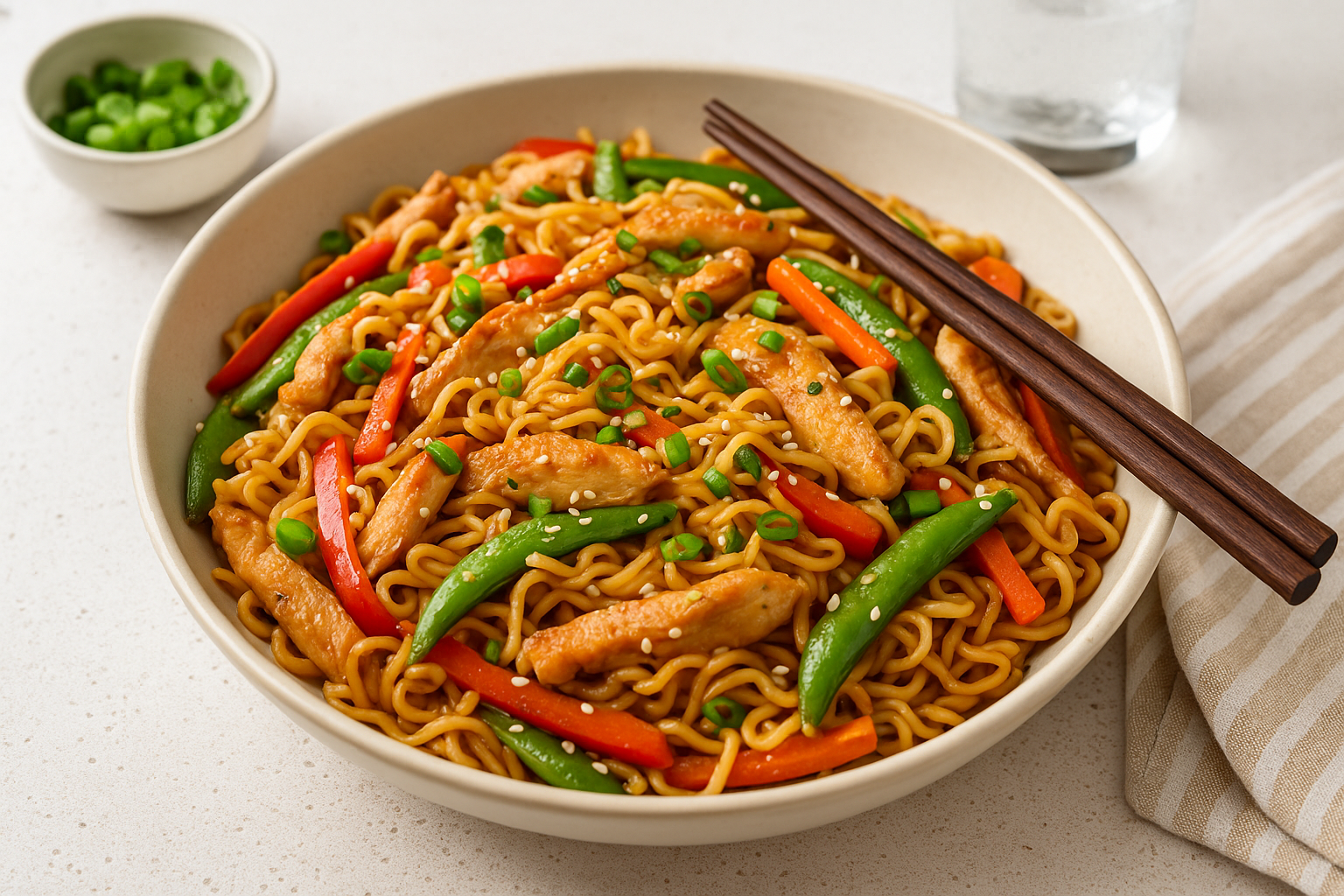 Remove the skillet from the heat. Sprinkle the stir-fry with sliced green onions and toasted sesame seeds for added crunch and flavour. Give everything one last gentle toss, then transfer the chicken ramen stir fry to a large serving platter or individual bowls. Serve hot, ensuring each portion contains a generous amount of chicken, vegetables, and noodles. Enjoy it immediately while it’s fresh and vibrant!