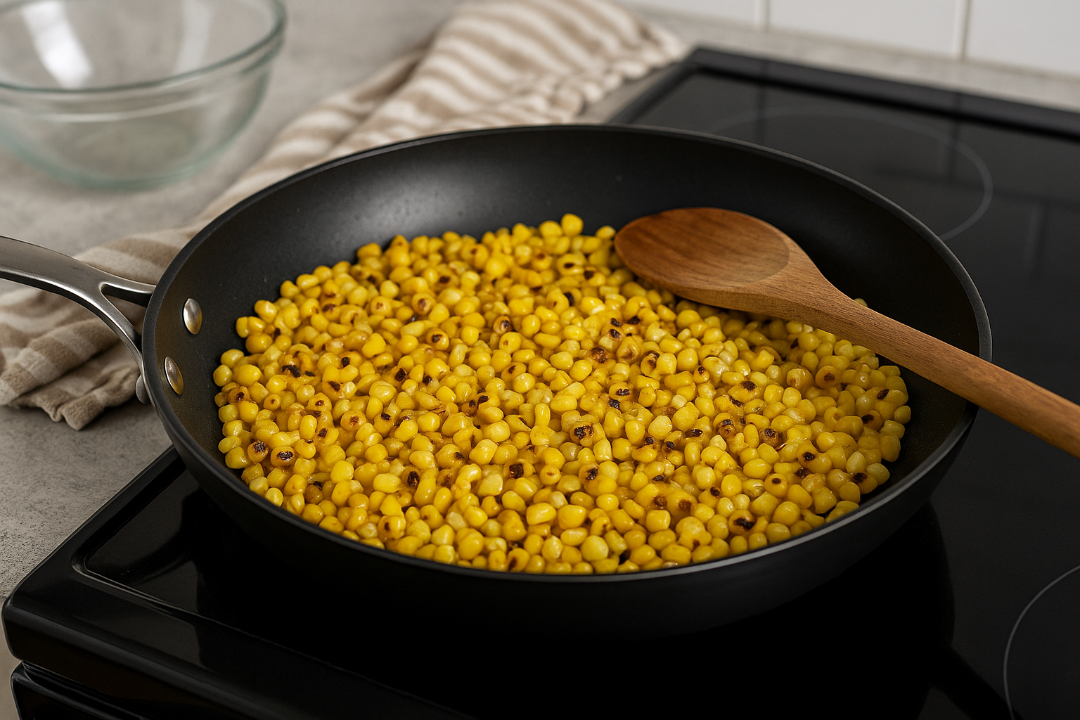 Heat a large skillet or sauté pan over medium-high heat. Add the fresh corn kernels (or thawed frozen corn) to the dry pan—no oil is needed. Spread the corn into an even layer and let it cook undisturbed for 2–3 minutes until it starts to char. Stir occasionally and continue cooking for another 5–6 minutes, until most kernels are lightly browned with some charred spots. Remove the corn from the heat and let it cool for a few minutes.
