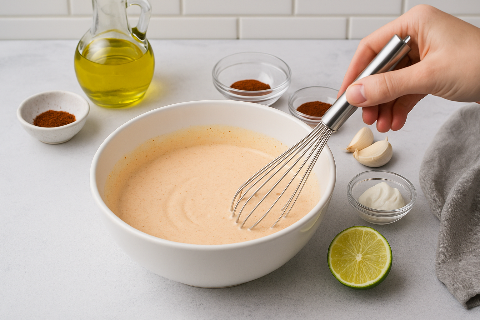 In a medium mixing bowl, combine mayonnaise, sour cream, fresh lime juice, minced garlic, chilli powder, smoked paprika, salt, and black pepper. Whisk everything together until the mixture is completely smooth and creamy. Taste and adjust seasoning if needed. Set the dressing aside while you assemble the salad.