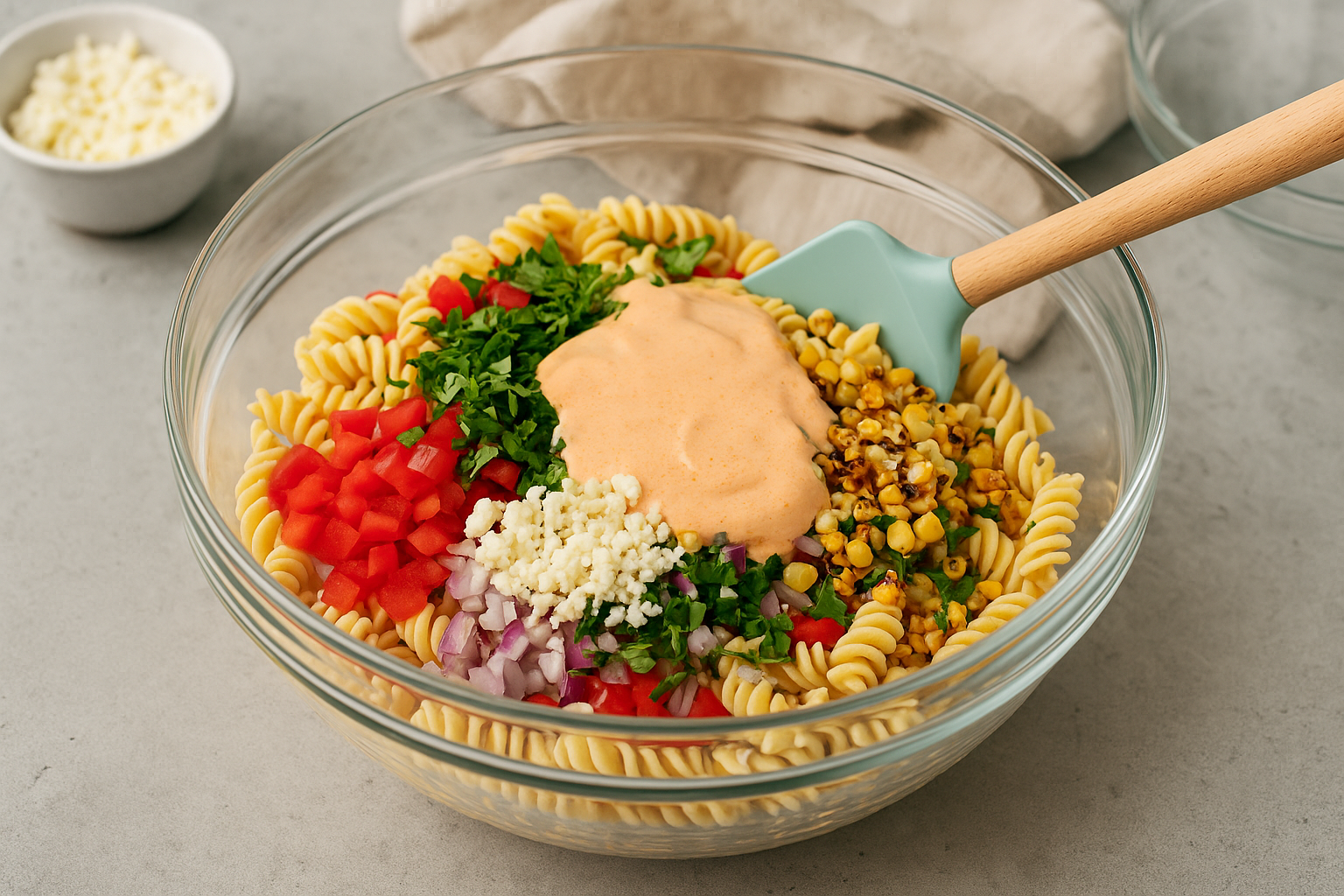 In a large mixing bowl, combine the cooled cooked pasta, charred corn, diced red bell pepper, finely chopped red onion, minced jalapeño, and chopped cilantro. Pour the creamy dressing over the ingredients. Use a rubber spatula or a large spoon to gently toss everything together until the pasta and vegetables are well-coated and evenly mixed. Add the crumbled cotija or feta cheese and fold it in gently. Taste and adjust seasoning if needed.