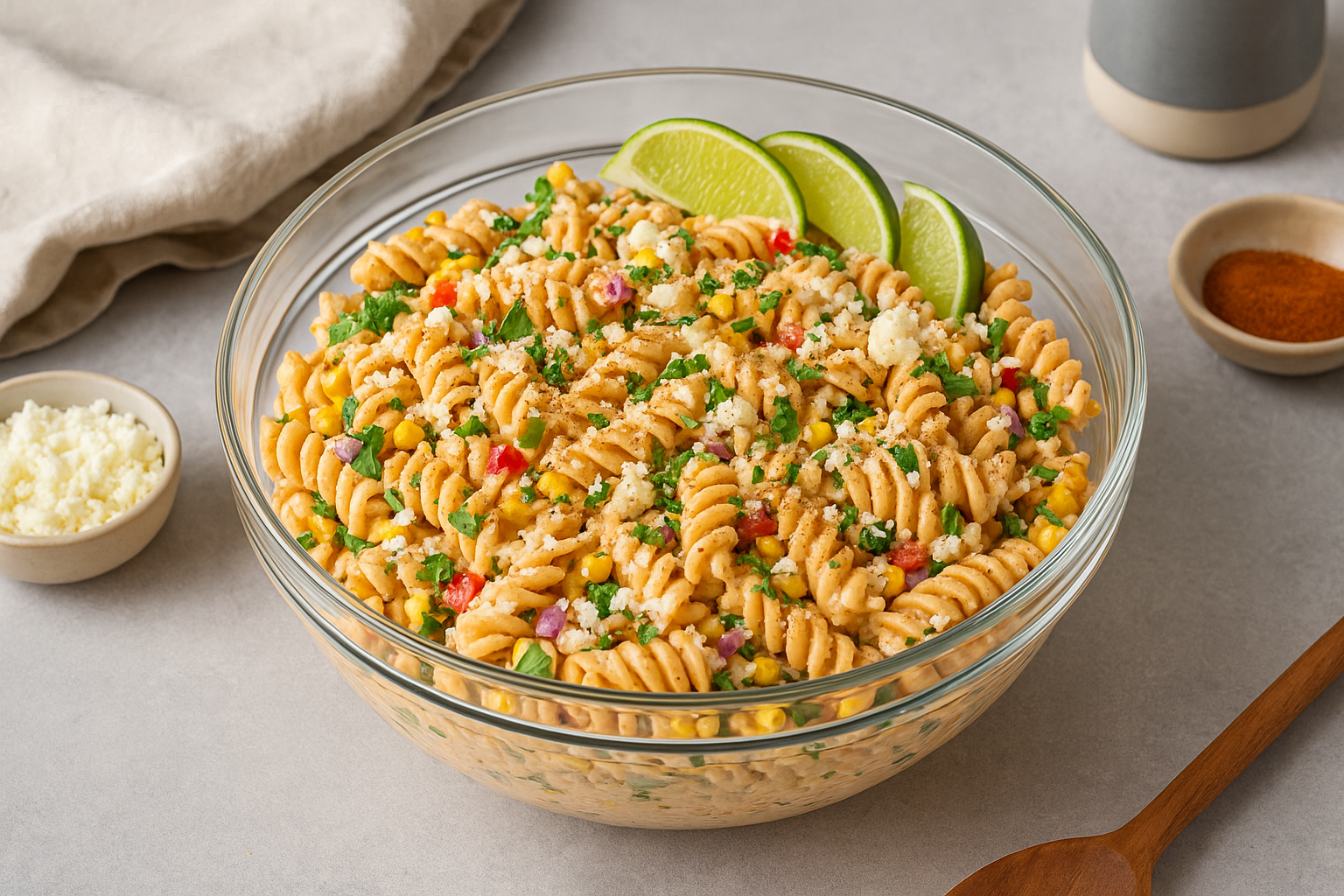 Cover the bowl with plastic wrap or a lid and refrigerate the pasta salad for at least 15–20 minutes, allowing the flavours to meld. Just before serving, give the salad a gentle toss and garnish with extra crumbled cotija or feta cheese, additional cilantro, lime wedges, and a sprinkle of chilli powder if desired. Serve chilled, and enjoy!