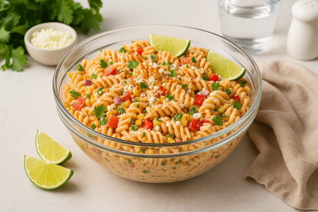 – Fusion Flavors: Combines the zesty, smoky goodness of Mexican street corn with the comforting creaminess of classic pasta salad for a unique twist.