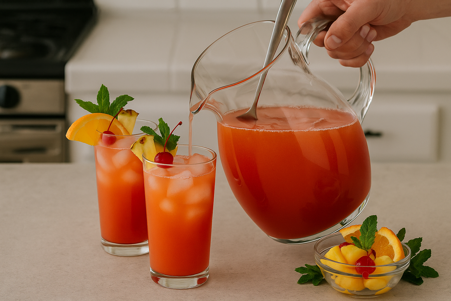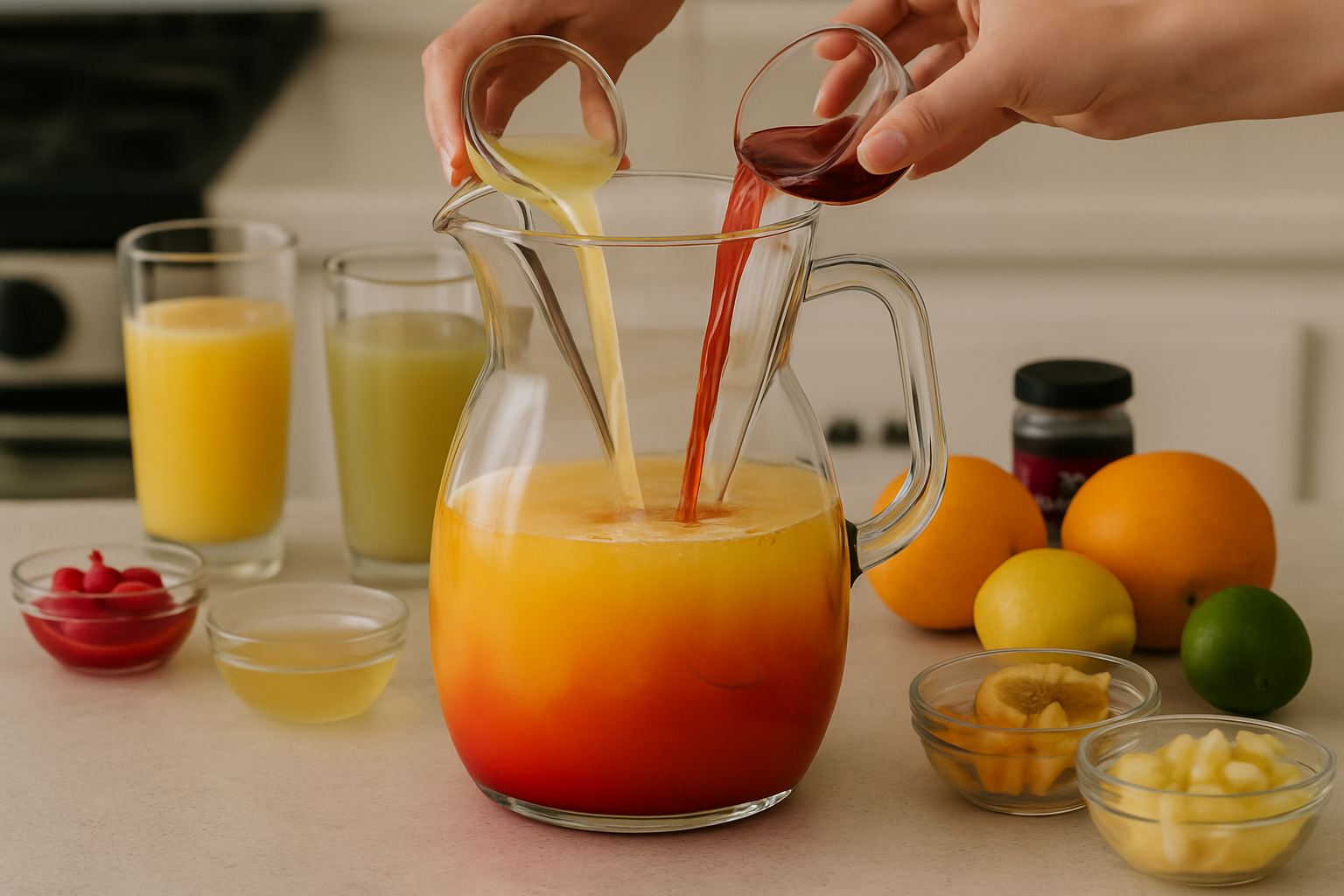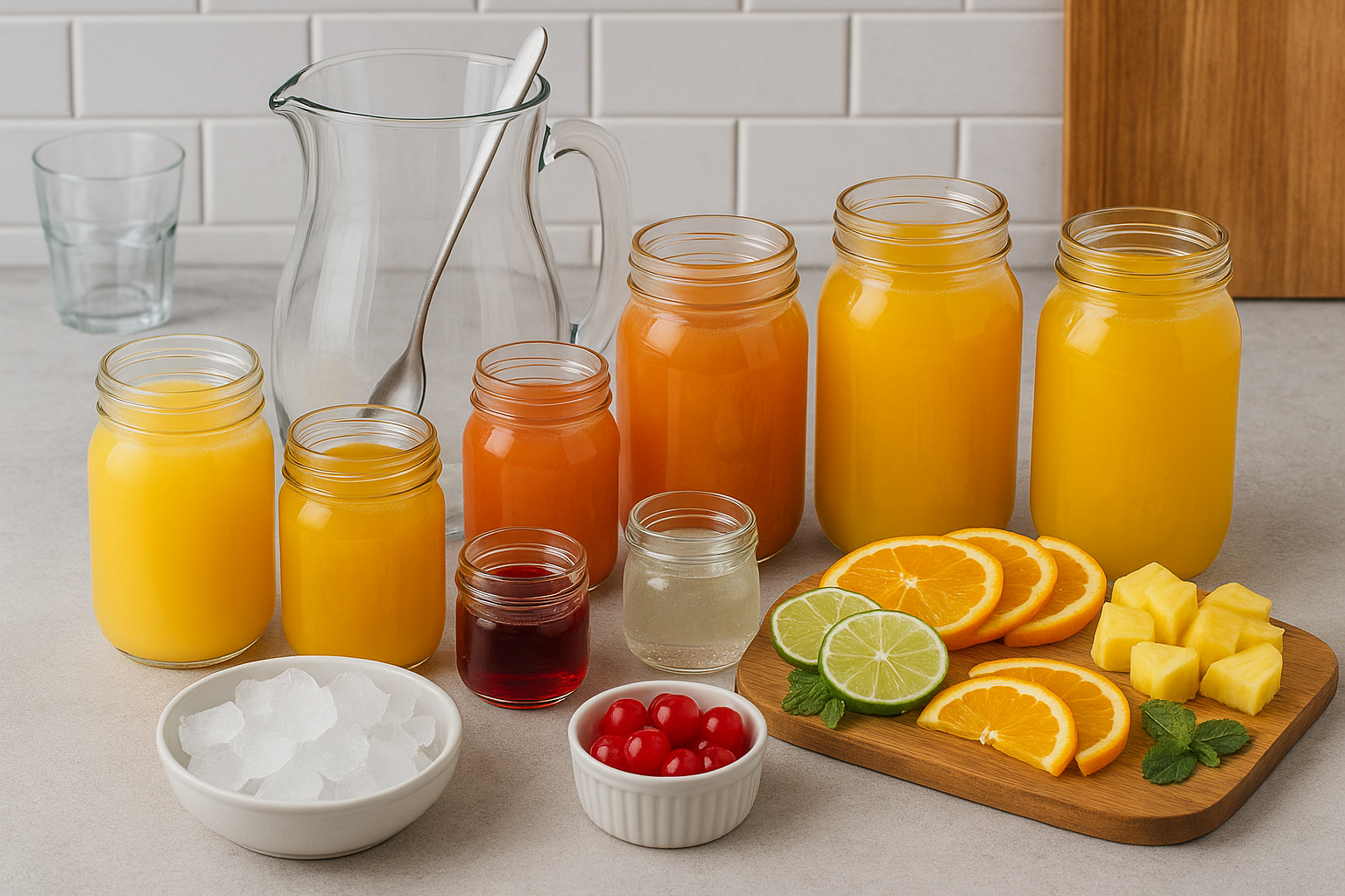 - Gather And Prepare All Ingredients- Start by gathering all the juices—pineapple, orange, guava, and mango—making sure they are well-chilled. Measure out the lemon-lime soda, grenadine syrup, and simple syrup (if using). Slice the fresh lemon and lime, cut the pineapple chunks, and prepare the orange slices. Also, prepare the maraschino cherries and mint leaves for garnish. Place all your prepared ingredients on the counter along with a large mixing pitcher, long spoon, and serving glasses.