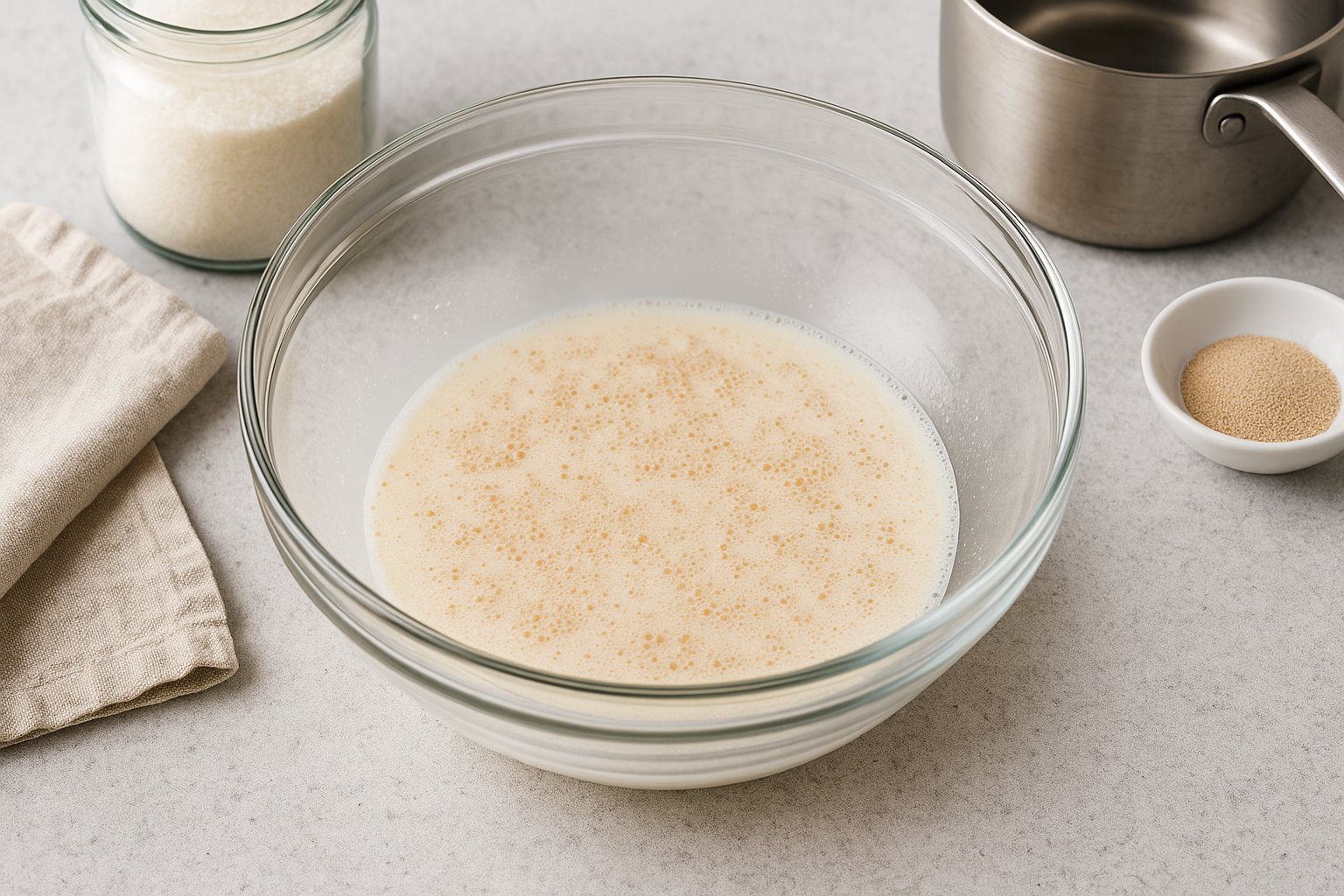 In a small saucepan, gently warm the whole milk until it’s just lukewarm (not hot, about 110°F/43°C). Pour the warm milk into a mixing bowl, add the granulated sugar and instant yeast. Stir and let sit for 5–10 minutes, until foamy.