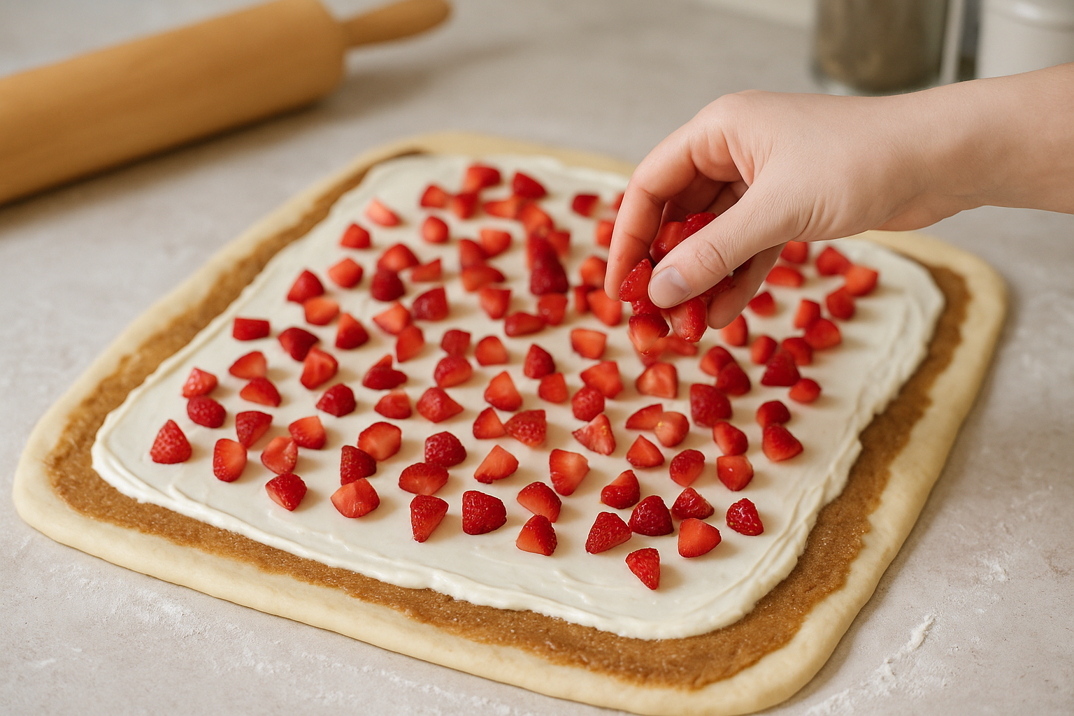 Using an offset spatula or the back of a spoon, evenly spread the cinnamon butter mixture over the rolled-out dough, leaving a small border. Next, gently spread the cream cheese mixture over the cinnamon butter layer. Finally, sprinkle the drained, sugared strawberries evenly over the top.