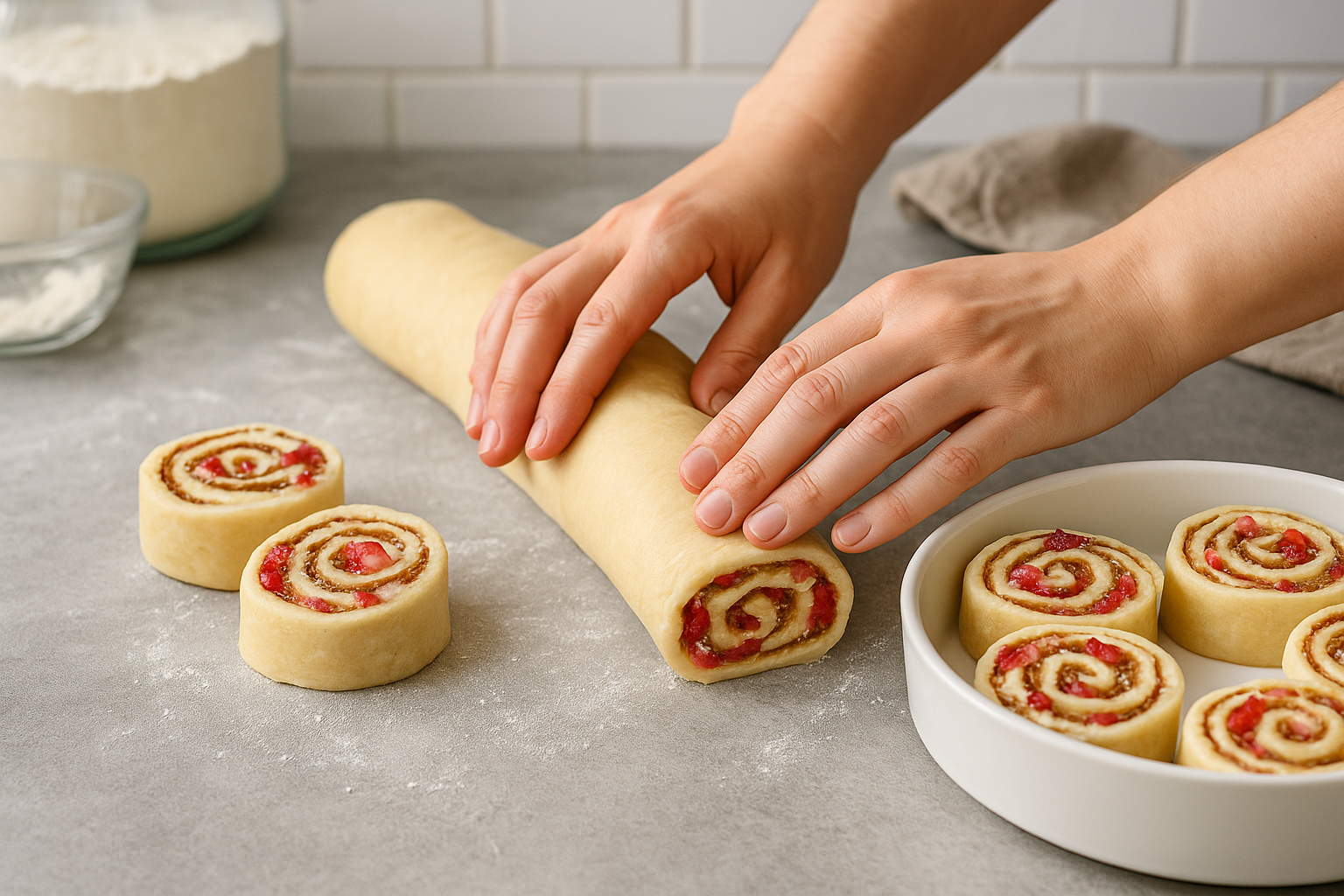 Starting from the longer edge, carefully roll the dough into a tight log, keeping the filling inside. Once rolled, use a sharp knife or unflavoured dental floss to cut the log into six even rolls. Arrange the rolls cut side up in a greased 8-inch round or square baking dish, leaving a little space between each roll for rising.
