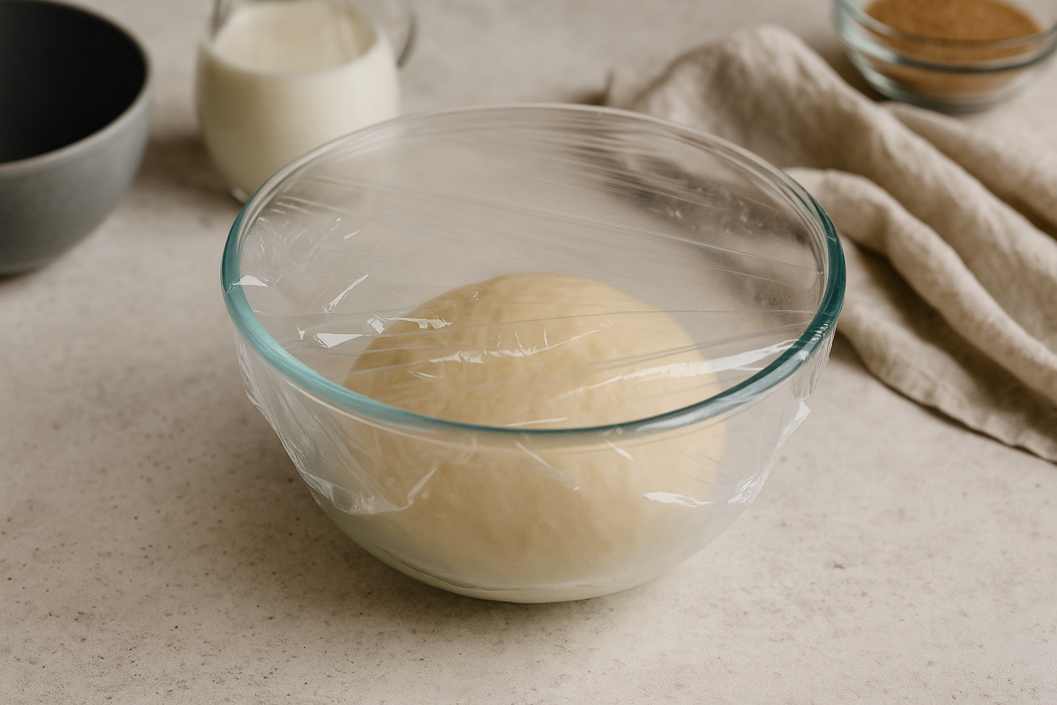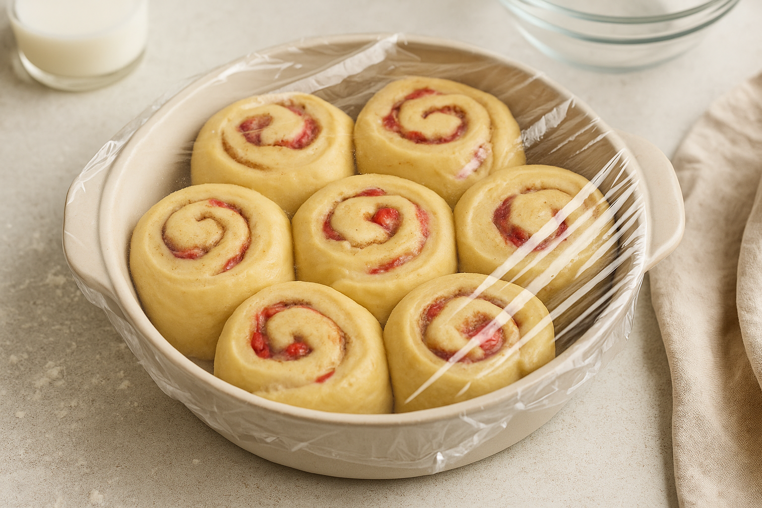 Cover the baking dish loosely with plastic wrap or a clean kitchen towel. Let the rolls rise in a warm, draft-free spot for 30–40 minutes, or until puffed up and nearly doubled in size.