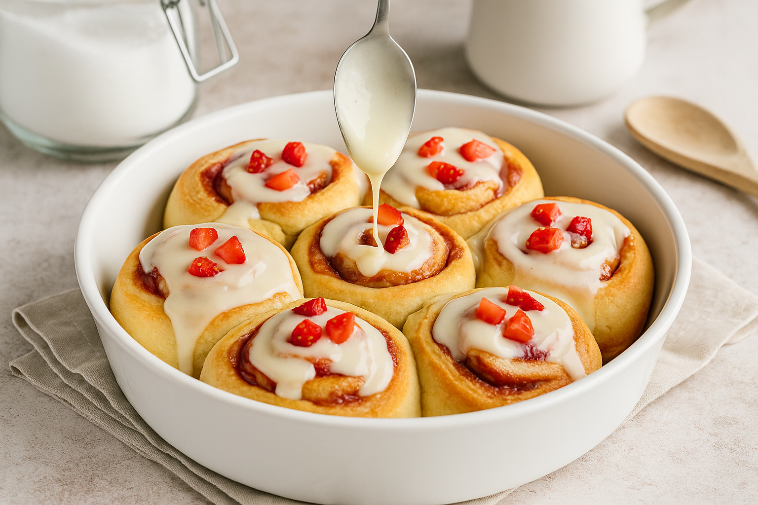 While the rolls are still warm (but not hot), generously drizzle or spread the cream cheese glaze over the top, letting it melt into all the swirls. Garnish with a few fresh diced strawberries if desired. Serve and enjoy!