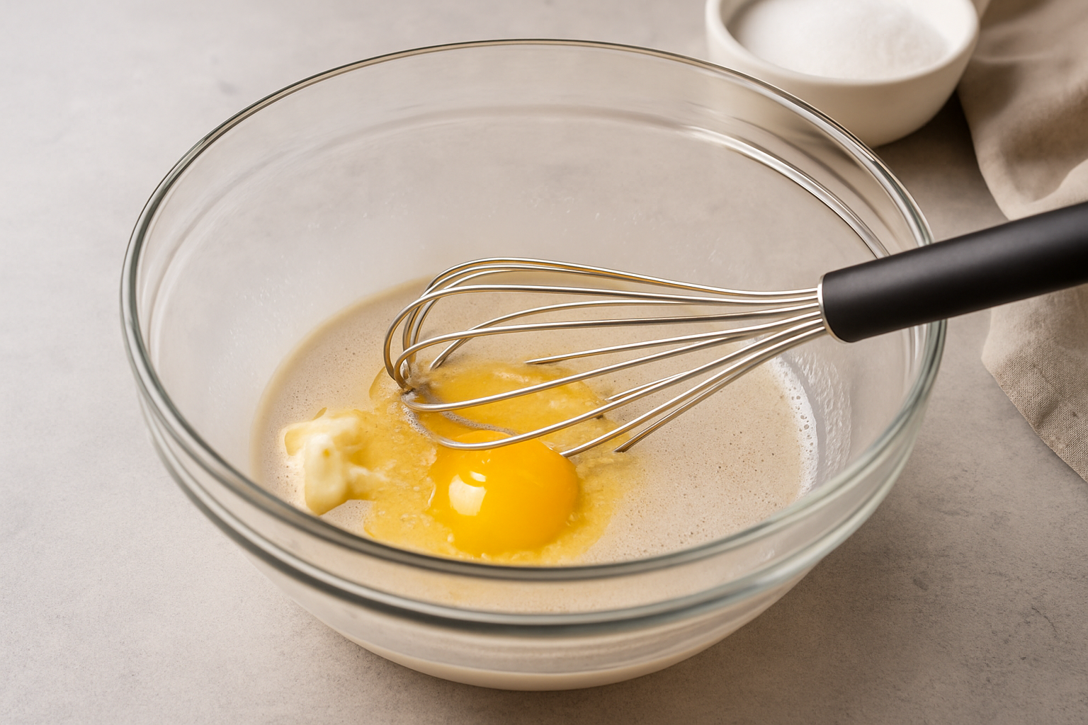 Once the yeast mixture is foamy, add the softened unsalted butter and the egg. Whisk together until well combined.