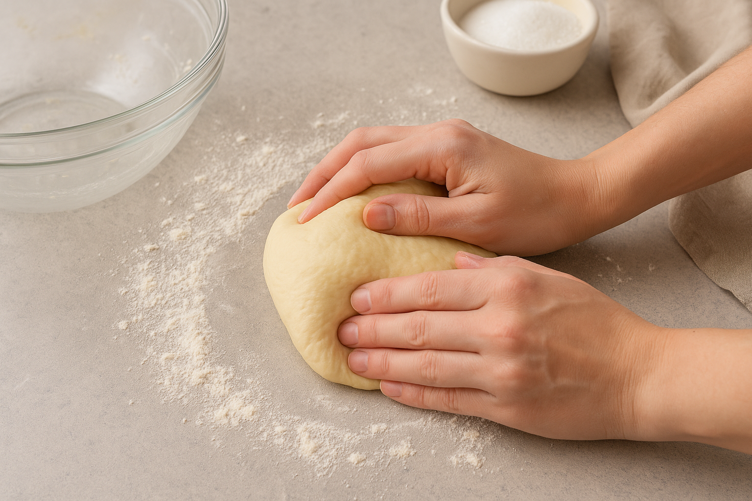 Turn the shaggy dough out onto a lightly floured surface. Knead by hand for 5–7 minutes, adding only as much flour as needed until the dough is soft and elastic.