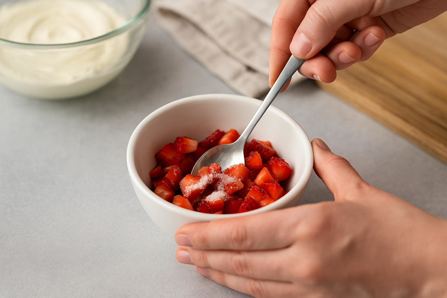 Place the diced fresh strawberries in a small bowl. Sprinkle one tablespoon of granulated sugar over them. Toss to combine, then set aside for at least 10 minutes so they become juicy.