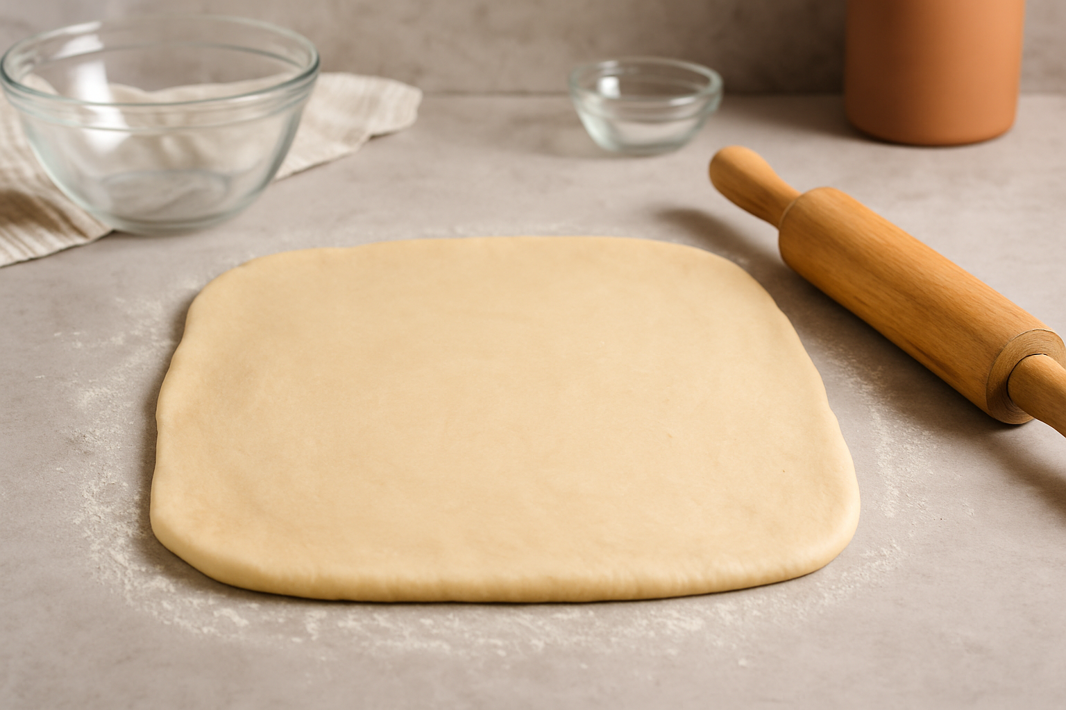 Once the dough has doubled in size, gently punch it down to release the air. Transfer to a lightly floured surface and use a rolling pin to roll the dough into a rectangle approximately 12 × 8 inches (30 × 20 cm). Keep the dough as even as possible in thickness.